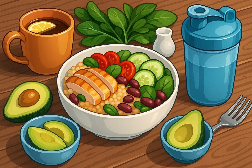 - киноа мен көкөністерден жасалған салат, авокадо қосылған — толық аминқышқылдары мен пайдалы майларға бай;