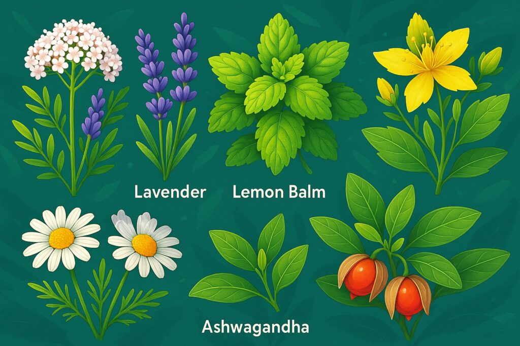Көптеген шөптердің арасынан ең жиі қолданылатын, жүйке жүйесіне оң әсер ететін түрлері төмендегідей: